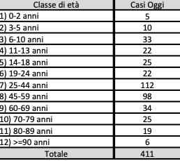 411 casi positivi rilevati su 3640 tamponi testati nel percorso nuove diagnosi di Covid 19. Sono 31 i ricoverati in intensiva, 105 in area medica.Nessun decesso