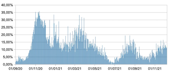 Il grafico mostra la percentuale di tamponi positivi giornalieri su tamponi giornalieri testati ( diagnostici+quelli di controllo) nel periodo 1 settembre 2020 –7 dicembre 2021 in Italia.