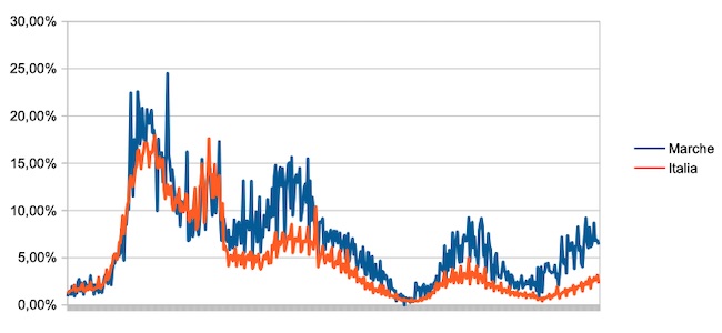 Il grafico seguente illustra l’andamento della percentuale giornaliera di nuovi casi positivi rispetto al corrispondente numero di tamponi (diagnostici +quelli di controllo) effettuati a livello nazionale e nella regione Marche nel periodo 1 settembre 2020 – 7 dicembre 2021.