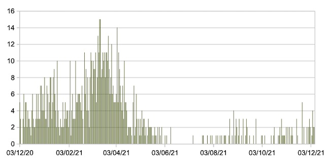 Il grafico seguente mostra i dati giornalieri relativi ai nuovi ingressi in terapia intensiva nelle Marche 3 dicembre 2020 – 7 dicembre 2021.