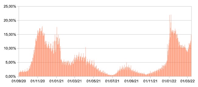 Il grafico mostra la percentuale di tamponi positivi giornalieri su tamponi giornalieri testati ( diagnostici+quelli di controllo) nel periodo 1 settembre 2020 – 13 marzo 2022 in Italia.