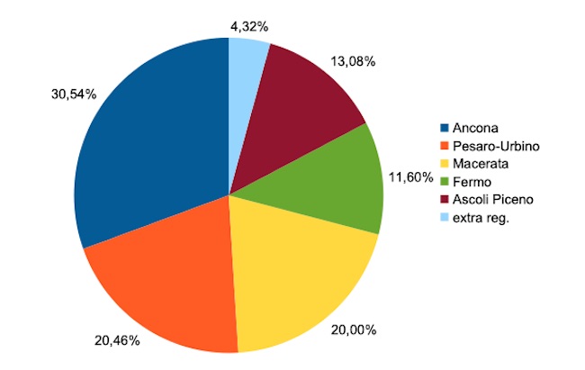 595 in provincia di Ancona,301 in provincia di Pesaro-Urbino,461 nella provincia di Macerata,301 nella provincia di Fermo, 367nella provincia di Ascoli Piceno,74 residenti fuori regione.
