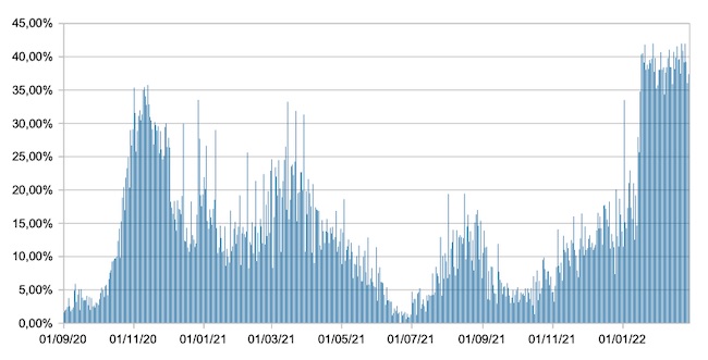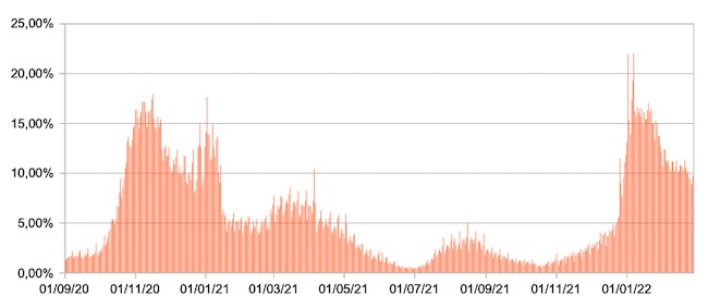 Il grafico mostra la percentuale di tamponi positivi giornalieri su tamponi giornalieri testati ( diagnostici+quelli di controllo) nel periodo 1 settembre 2020 – 27 febbraio 2022 in Italia.