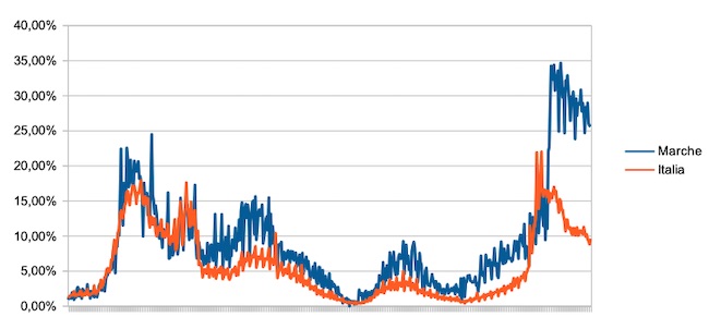 Il grafico seguente illustra l’andamento della percentuale giornaliera di nuovi casi positivi rispetto al corrispondente numero di tamponi (diagnostici +quelli di controllo) effettuati a livello nazionale e nella regione Marche nel periodo 1 settembre 2020 – 27 febbraio 2022.
