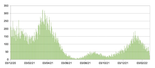 Nel grafico sono riportati i valori medi settimanali.Il valore medio della settimana 20/02/22-26/02/22 è 790,60 (la scorsa settimana era 1076,97):netta discesa della curva in quattro settimane.
