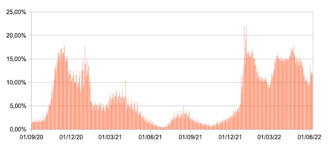 Il grafico mostra la percentuale di tamponi positivi giornalieri su tamponi giornalieri testati ( diagnostici+quelli di controllo) nel periodo 1 settembre 2020 – 8 giugno 2022 in Italia.