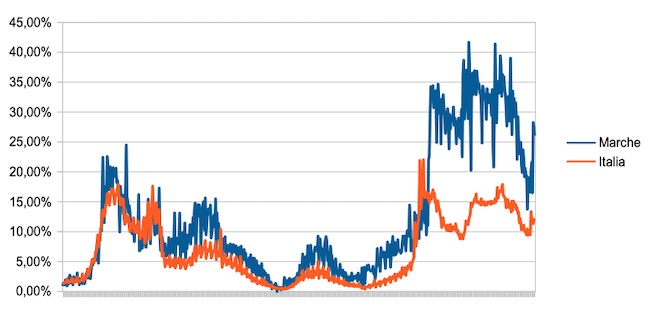 Il grafico seguente illustra l’andamento della percentuale giornaliera di nuovi casi positivi rispetto al corrispondente numero di tamponi effettuati a livello nazionale e nella regione Marche nel periodo 1 settembre 2020 – 8 giugno 2022.