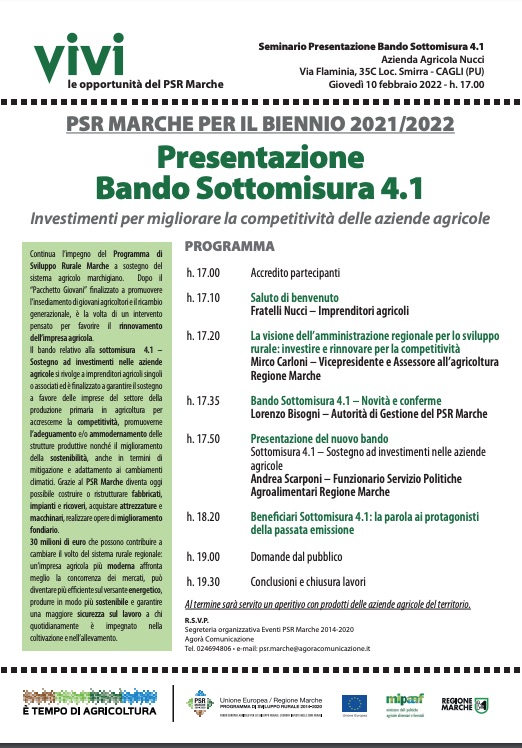 Giovedì 10 febbraio, presso l’Azienda Agricola Nucci nuovo appuntamento organizzato dal PSR Marche per il biennio 2021/2022; si parlerà di Investimenti per migliorare la competitività delle aziende agricole
