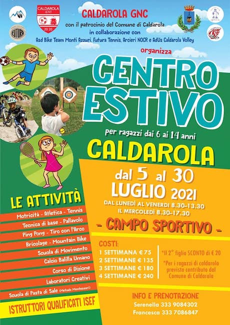 Il Centro Estivo organizzato da Caldarola GNC interesserà bambini e ragazzi dai 6 ai 14 anni, avrà come base, il piazzale del Campo Sportivo di Via Matteotti, sarà supportato dalle associazioni, ASD Bike Monti Azzurri, Futura Tennis, Arcieri NOCR, Caldarola Volley ed avrà un costo di €. 75 per 1 settimana, €. 135 per 2 settimane, €. 180 per 3 settimane e di €.240 per 4 settimane.