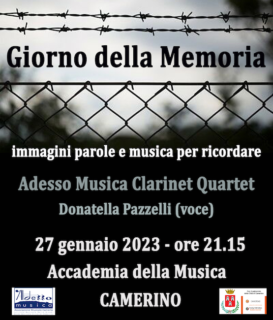 CAMERINO – “Giorno della Memoria – immagini parole e musica per ricordare” tornerà in presenza nell’Auditorium Andrea Bocelli dell’Accademia della musica di Camerino venerdì 27 gennaio 2023 alle ore 21.15, grazie all’Associazione Adesso Musica con il patrocinio della Città di Camerino.