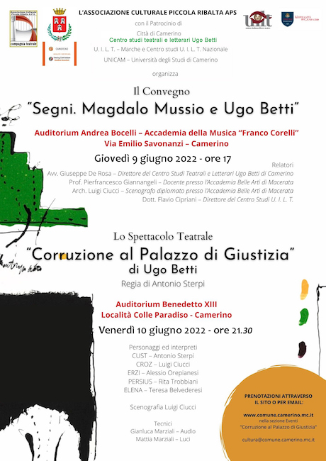 Una due giorni dedicata a Ugo Betti in occasione del momento conclusivo del premio nazionale a lui intitolato:il 9 giugno convegno: “Segni. Magdalo Mussio e Ugo Betti”, il 10 giugno rappresentazione: “Corruzione al Palazzo di Giustizia” di Ugo Betti