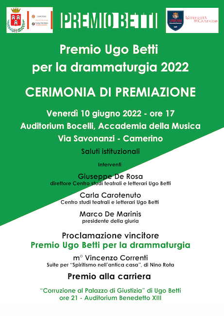 CAMERINO – Venerdì 10 giugno 2022, alle ore 17, nell’Auditorium Andrea Bocelli dell’Accademia della musica “Franco Corelli” di Camerino, si terrà la cerimonia di premiazione del “Premio Ugo Betti per la drammaturgia”, organizzato dal Centro studi teatrali e letterari Ugo Betti del Comune di Camerino. Dopo i saluti istituzionali del dott. Paolo De Biagi, commissario straordinario della città di Camerino e del prof. Claudio Pettinari, rettore Unicam, interverranno Giuseppe De Rosa e Carla Carotenuto del Centro studi Betti e a seguire Marco De Marinis, presidente della giuria, che insieme a Pierfrancesco Giannangeli, Vincenzo Luzi e Massimo Marino ha valutato i 27 testi in gara. Dopo la proclamazione del vincitore e dei segnalati il M° Vincenzo Correnti eseguirà, di Nino Rota, la suite per il dramma in tre atti di Ugo Betti “Spiritismo nell’antica casa”. In conclusione verrà consegnato il Premio alla carriera.