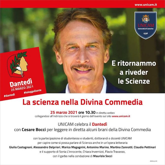 “Anche Unicam ha voluto celebrare il Dantedì, quest’anno in una edizione ancor più significativa perché avviene nel settecentesimo anniversario della morte di Dante Alighieri. Ringrazio di cuore l’amico Cesare Bocci per aver accolto senza esitazioni il nostro invito dimostrando un grande senso di appartenenza ad UNICAM, e ringrazio allo stesso modo tutte le studentesse, i dottorandi ed i colleghi che si sono subito resi disponibili e stanno preparando le loro presentazioni. Avvicinare i giovani alla scienza è fondamentale per il nostro ed il loro futuro, farlo in maniera coinvolgente ed interdisciplinare lo è ancora di più: Unicam ci crede e da tempo ha avviato una serie di iniziative di successo sulla comunicazione scientifica”.