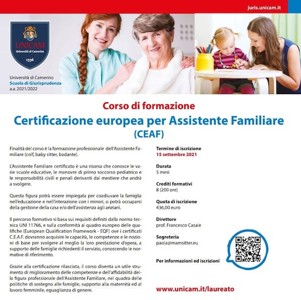 CAMERINO – La Scuola di Giurisprudenza dell’Università di Camerino avvia il corso di formazione in “Certificazione europea per Assistente Familiare”, che ha come finalità appunto quella della formazione professionale dell’Assistente Familiare (colf, baby sitter, badante).