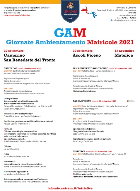 L’appuntamento con le Giornate di Ambientamento per le matricole è per lunedì 20 settembre, in concomitanza con l’inizio delle lezioni del nuovo anno accademico, nelle sedi di Camerino e San Benedetto del Tronto, mercoledì 30 settembre nella sede di Ascoli Piceno e mercoledì 17 novembre nella sede di Matelica.