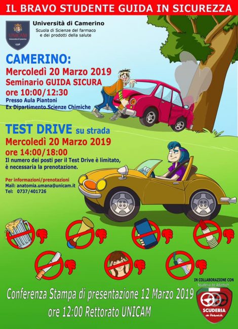 Nella mattinata presso l’aula Piantoni del Polo di Chimica con inizio alle ore 10 si terrà un seminario sulla guida sicura, mentre nel pomeriggio è previsto un test drive su strada con quattro Maserati messe a disposizione dalla Scuderia De Adamich riservato agli studenti Unicam. Il numero dei posti per il test drive è limitato ed è pertanto necessaria la prenotazione alla mail anatomia.umana@unicam.it