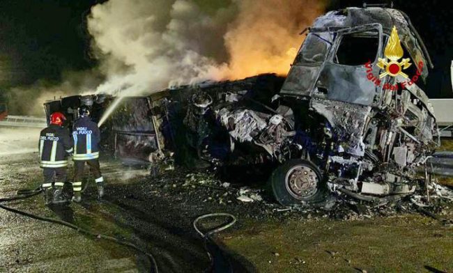 MONTEMARCIANO (ANCONA) – Nella notte un autoarticolato con semirimorchio frigorifero ha urtato il guardrail sulla rampa del casello di Montemarciano, direzione sud, si è rovesciato e poi ha preso fuoco. Sono state necessarie quasi sette ore d’intervento da parte dei vigili del fuoco, con sette automezzi e 15 uomini, per spegnere l’incendio e mettere in sicurezza lo scenario dell’incidente.