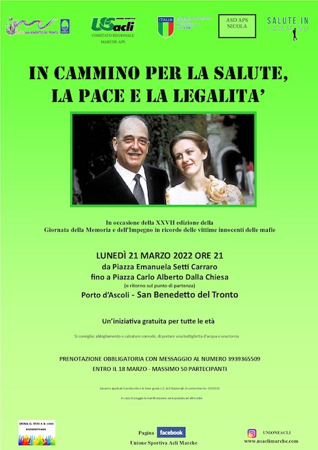 SAN BENEDETTO DEL TRONTO – Il 21 marzo 2022, in occasione della Giornata della Memoria e dell’Impegno in ricordo delle vittime innocenti delle mafie, si svolgerà “In cammino per la salute, la pace e la legalità” con partenza da Piazza Emanuela Setti Carraro alle 21.