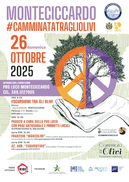 È dedicata alla Pace l’edizione 2025 della “Camminata tra gli olivi” a Monteciccardo che prevede: percorso di 6 chilometri da Villa Ugolini; momento di condivisione “Coltiviamo la Pace”; pranzo con i prodotti tipici a cura della Pro Loco; visite ai frantoi e degustazioni guidate del pomeriggio