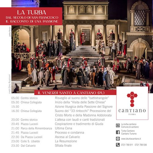 La Sacra Rappresentazione della Passione di Gesù del Venerdì Santo, nota come “la Turba” di Cantiano, dal secolo di San Francesco, ogni anno, rievoca nelle forme del teatro popolare-religioso la Passione, Morte e Resurrezione di Cristo