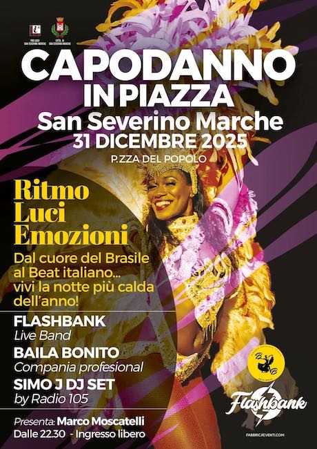 Sotto la regia di Fabbricaeventi.com e con la conduzione di Marco Moscatelli, la serata promette un’esplosione di energia. Sul palco salirà la live band Flashbank, che scalderà il pubblico con i grandi successi del beat italiano e internazionale. Il ritmo si farà ancora più coinvolgente con la presenza della compagnia professionale Baila Bonito, che porterà nel cuore di San Severino Marche il calore e i colori delle atmosfere brasiliane.