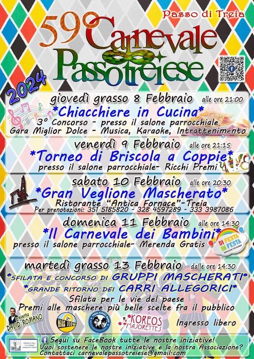 TREIA – Torna il “Carnevale Passotreiese”, la classica manifestazione carnevalesca che da sempre porta allegria e divertimento. La 59esima edizione si svolgerà dall’8 al 13 febbraio e proporrà un ricco calendario di imperdibili eventi.