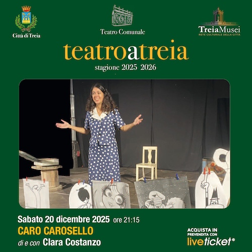TREIA(MC) – Sabato 20 dicembre 2025, alle ore 21.15, al Teatro Comunale a Treia andrà in scena “Caro Carosello” di e con Clara Costanzo, lo spettacolo che racconta la magia della televisione e dell’iconica trasmissione Carosello.