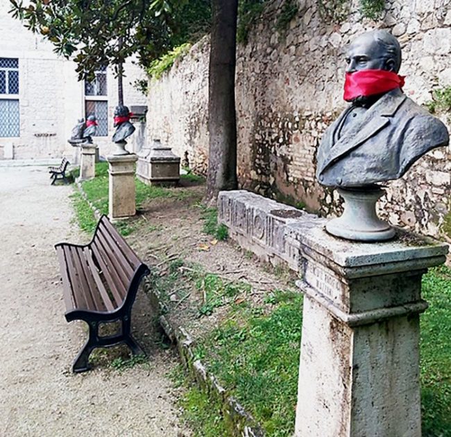 ANCONA – Statue imbavagliate di rosso da CasaPound anche ad Ancona e in altre città delle Marche come Ascoli Piceno, Macerata, Fabriano, Senigallia.