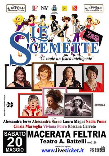 MACERATA FELTRIA – Arrivano! Forti e unite, le quote Rosa del cabaret di Zelig e Colorado: Rossana Carretto, Alessandra Ierse, Laura Magni, Cinzia Marseglia, Viviana Porro, Nadia Puma e Alessandra Sarno. Sette attrici comiche che Sabato 20 Maggio, sul palco del Teatro Battelli di Macerata Feltria presenteranno il loro ultimo lavoro: ‘Ci Vuole un fisico intelligente.
