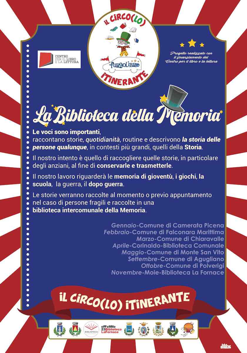 La prima delle iniziative sarà la Biblioteca della Memoria che, grazie agli operatori di Radio Incredibile, andrà a raccogliere le voci dei nostri anziani. Le voci sono importanti, raccontano storie, quotidianità, routine e descrivono la storia delle persone qualunque, in contesti più grandi, quelli della Storia. Il nostro intento è quello di raccogliere quelle storie, in particolare degli anziani, al fine di conservarle e trasmetterle. Il primo degli appuntamenti sarà presso il centro sociale L’incontro di Camerata Picena e, nei mesi successivi negli altri comuni aderenti.