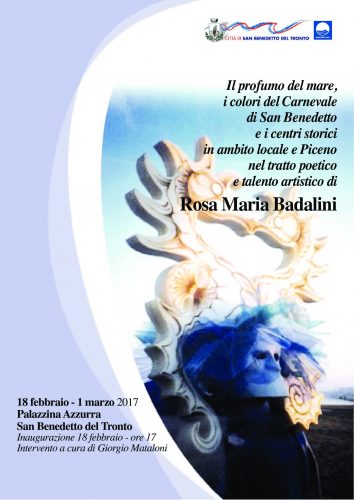“Maschere e colori di Rosa Maria”, personale di Rosa Maria Badalini, dal 18 febbraio al 1 marzo presso la palazzina azzurra di San Benedetto del Tronto, dal martedì alla domenica (10-13/16-19).