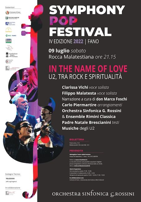 FANO (PU) – La musica pop in chiave sinfonica per un altro grande appuntamento con il Symphony Pop Festival, la rassegna concertistica organizzata dall’Orchestra Sinfonica G. Rossini. Sabato 9 luglio 2022, alle 21.15, alla Rocca Malatestiana di Fano sarà la volta di “In the Name of Love. U2, tra rock e spiritualità”.