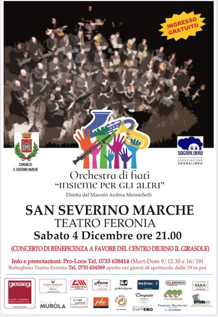 SAN SEVERINO MARCHE – Nell’ambito delle iniziative natalizie della rassegna “HoHoHo! Per Natale vorrei…”, il Comune di San Severino Marche e l’associazione Sognalibro, con la collaborazione dei Teatri di Sanseverino, organizzano per oggi, sabato 4 dicembre 2021, a partire dalle ore 21 al Feronia, un concerto di beneficenza a favore del Centro socio educativo riabilitativo diurno “Il Girasole”.