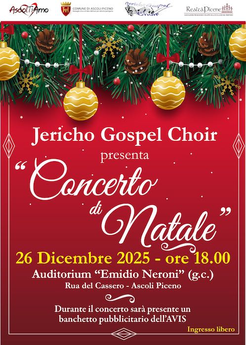 ASCOLI PICENO – Venerdì, 26 dicembre, alle ore 1800, all’auditorium “Emidio Neroni” (rua del Cassero), si svolgerà il “Concerto di Natale 2025” con il Jericho Gospel Choir, organizzato in collaborazione e con il supporto dell’associazione AscolTiAmo. Un appuntamento che va oltre la musica e che celebra il valore della solidarietà. “Un evento speciale – ha detto il sindaco Marco Fioravanti – che ci darà la possibilità di vivere appieno i valori delle festività natalizie. La musica del Jericho Gospel Choir accompagnerà l’impegno sociale di queste associazioni, da sempre attente ai bisogni del territorio e pronte a dare una mano a chi ha bisogno”. L’assessore agli Eventi, Giovanni Silvestri, ha aggiunto: “Un’iniziativa di grande valore sotto diversi punti di vista: artistico, sociale, umano. Il calendario degli eventi natalizi è ricco di appuntamenti e questo del 26 dicembre riveste particolare importanza, perché ingloba anche un elemento solidale di grande rilevanza”.