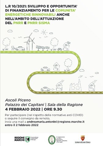 ASCOLI PICENO – Venerdì 4 febbraio 2022, a partire dalle ore 9.30 presso la Sala della Ragione del Palazzo dei Capitani, ad Ascoli Piceno si terrà il Convegno dal titolo “Sviluppo e opportunità di finanziamento per le Comunità energetiche rinnovabili anche nell’ambito dell’attuazione del Pnrr e Pnrr Sisma”.