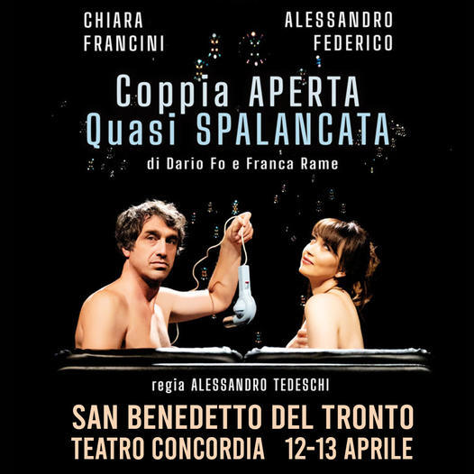 SAN BENEDETTO DEL TRONTO – Martedì 12 e mercoledì 13 aprile 2022, alle ore 20.45, al Teatro Concordia di San Benedetto del Tronto, andrà in scena “Coppia aperta quasi spalancata”,uno dei testi più popolari di Dario Fo e Franca Rame. Lo spettacolo è interpretato da Chiara Francini con Alessandro Federico, per la regia di Alessandro Tedeschi.