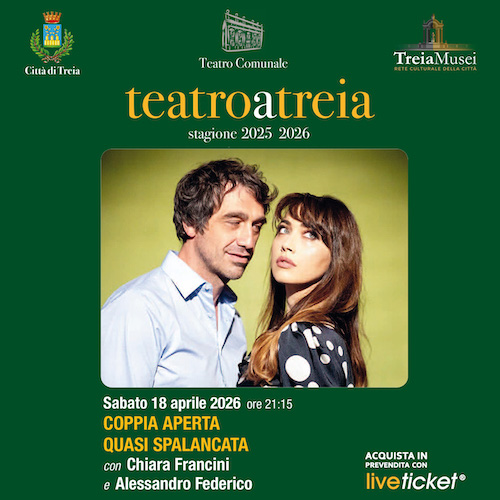 TREIA (MC) – Si chiude con uno dei testi più iconici del teatro contemporaneo la stagione teatrale di Treia. Sabato alle 21.15 al Teatro comunale “Fabiano Valenti” andrà in scena l’ultimo appuntamento in programma: “Coppia aperta, quasi spalancata”, riadattamento della celebre commedia di Dario Fo e Franca Rame, interpretata da Chiara Francini e Alessandro Federico.