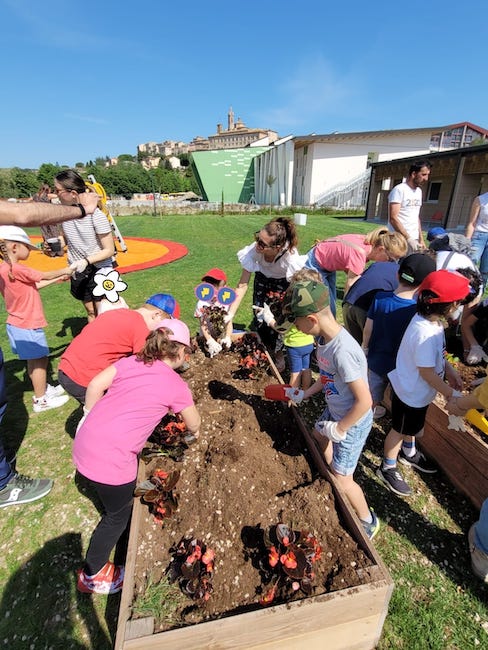 Una volta inaugurata l’Aula Verde, le insegnanti, i bambini e le famiglie presenti si sono divertiti tutti insieme a piantare ortaggi, erbe aromatiche e fiori donate dall’Ortofiorito. Terminato di piantumare, è stata la volta dell’apicoltore Marco Tinti che ha illustrato ai bambini come è fatta un’arnia.