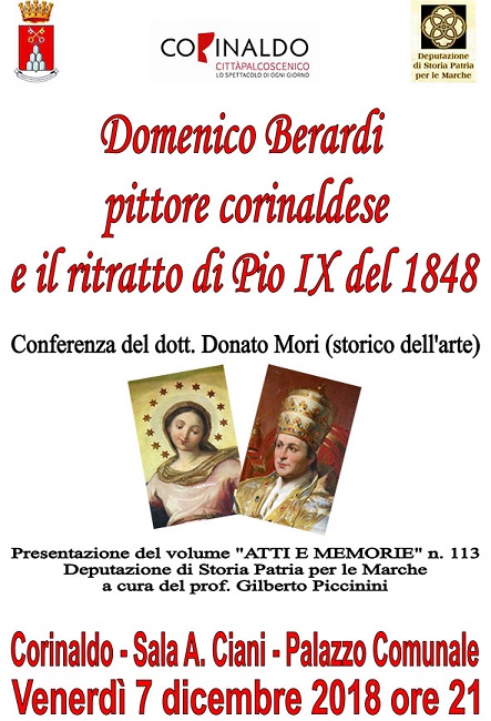 CORINALDO – Venerdì 7 dicembre alle ore 21, nella sala A. Ciani del Palazzo Municipale di Corinaldo l’Assessorato alla Cultura con il Patrocinio della Deputazione di Storia Patria per le Marche organizza una conferenza dello storico dell’arte Donato Mori sul pittore Domenico Berardi, nato a Corinaldo 200 anni fa, e sulla storia del ritratto di Pio IX da lui dipinto nel 1848, conservato nella locale Civica Raccolta d’Arte “C. Ridolfi”.