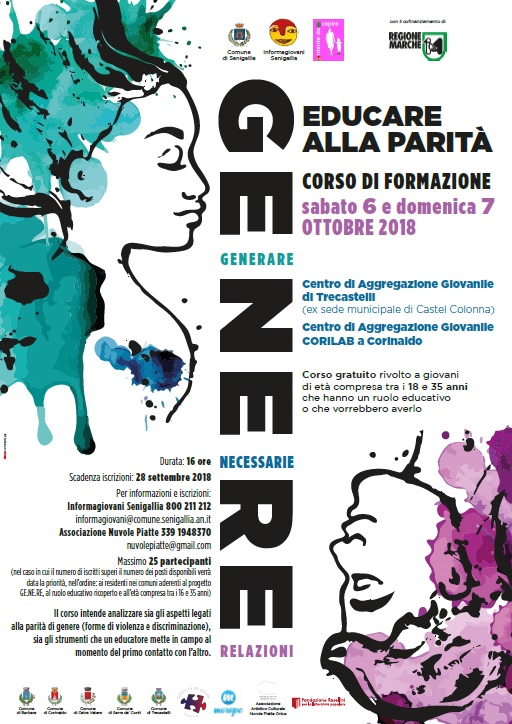 CORINALDO (AN) – Si svolgerà nel Centro di Aggregazione Giovanile CoriLab di Corinaldo e nel Centro di Aggregazione Giovanile di Trecastelli (ex sede municipale di Castel Colonna) di Trecastelli, nel weekend di sabato 6 domenica 7 ottobre 2018, il corso di formazione gratuito sulla parità di genere.