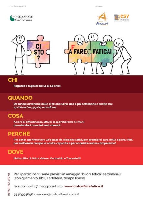 CORINALDO – Riparte a Corinaldo anche nell’estate 2021 il progetto “Ci sto? Affare fatica!” giunto ormai alla terza edizione. L’attività estiva coinvolge le comunità locali nella cura dei beni comuni e nella formazione delle giovani generazioni.