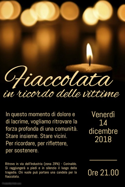CORINALDO / La comunità di Corinaldo spontaneamente e insieme a tutte le associazioni corinaldesi organizza, venerdì 14 dicembre 2018 alle ore 21.00 una fiaccolata in ricordo