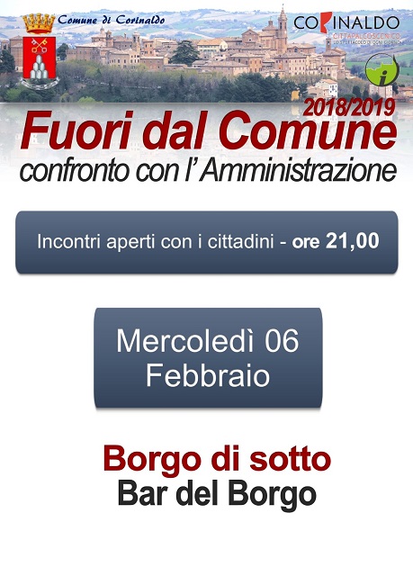 CORINALDO – Mercoledì 6 febbraio ,alle ore 21.00 al Bar del Borgo di Corinaldo, si terrà il quarto di undici incontri aperti tra Amministrazione e cittadinanza.