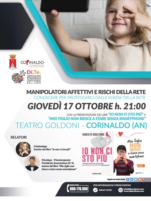 CORINALDO – Il Comune di Corinaldo in collaborazione con Di.Te.-Associazione nazionale dipendenze tecnologiche gap cyberbullismo presenta, giovedì 17 ottobre alle ore 21 al teatro “C.Goldoni”, “Manipolatori affettivi e rischi della rete-Conoscere per proteggerci dalle insidie della rete.”