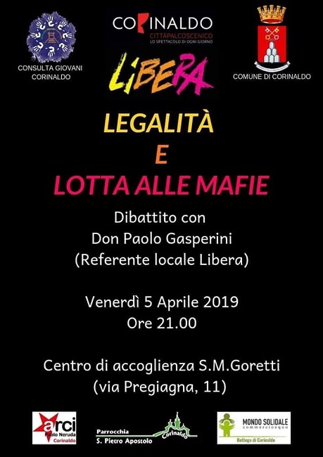 CORINALDO – La Consulta dei giovani corinaldesi e il suo presidente Lorenzo Bucci affiancati dall’ Amministrazione comunale, in collaborazione con l’associazione ‘Libera’, l’Arci ‘Pablo Neruda’, la Parrocchia di S. Pietro Apostolo e il Mondo del Commercio EquoSolidale presentano venerdì 5 aprile ore 21.00 nel Centro di accoglienza S.M.Goretti (via Pregiagna), “Legalità e Lotta alle mafie”, dibattito con il referente locale “Libera”, Don Paolo Gasperini.