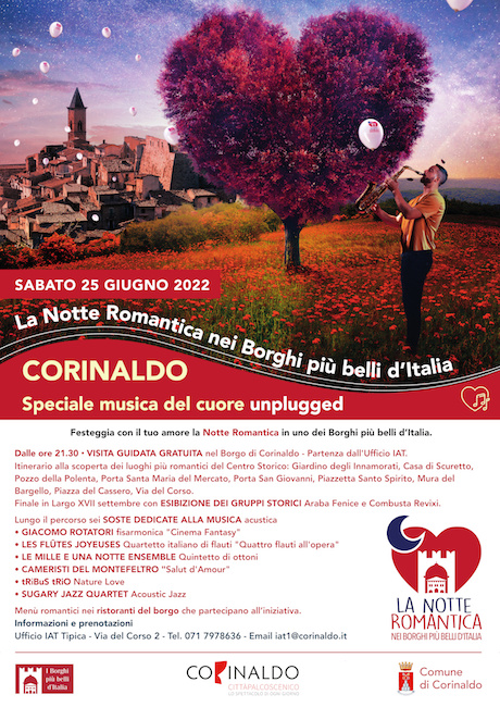 CORINALDO – Sul palcoscenico di Corinaldo, nel primo week end dell’estate 2022, va in scena la Notte Romantica nei Borghi più belli d’Italia, evento turistico-culturale nazionale che celebra l’arrivo dell’estate. Giunta quest’anno alla settima edizione, la Notte Romantica celebra l’amore e il romanticismo con il fascino di piazze, vicoli e palazzi nei Borghi più belli d’Italia. Una serata indimenticabile, in un’atmosfera raccolta, lungo le vie del centro storico.