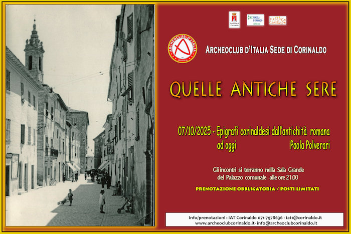 CORINALDO – Martedì 7 ottobre 2025 alle ore 21.00, presso la Sala Consiliare del Comune di Corinaldo, si terrà il terzo incontro della Rassegna “Quelle Antiche Sere” organizzata dall’Archeoclub di Corinaldo. L’intervento, dal titolo Epigrafi corinaldesi dall’antichità romana ad oggi, sarà a cura di Paola Polverari.