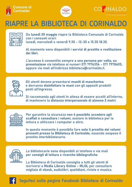 Aggiornamenti e informazioni al numero 071 7976356, via email all’indirizzo biblioteca@corinaldo.it o sulla pagina Facebook Biblioteca Comunale di Corinaldo.