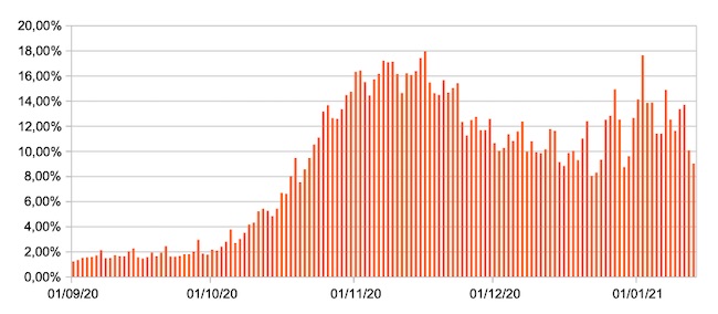 Il grafico mostra la percentuale di tamponi positivi giornalieri su tamponi giornalieri (nuove diagnosi) nel periodo 1 settembre 2020 – 13 gennaio 2021 nelle Marche