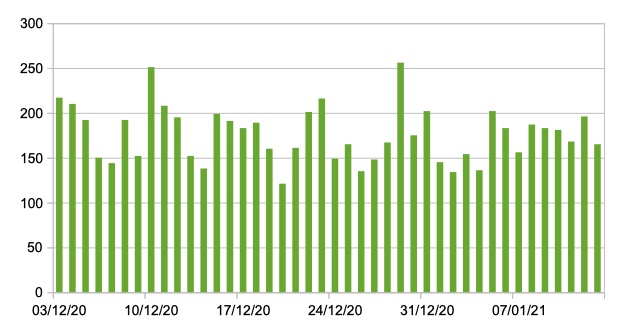 Il grafico seguente mostra i dati giornalieri ,a livello nazionale, relativi ai nuovi ingressi in terapia intensiva 3 dicembre 2020 -13 gennaio 2021